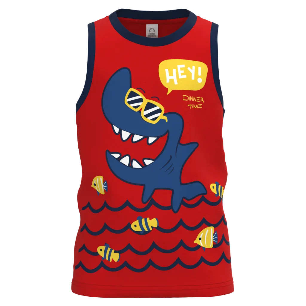 Red Cotton Sleeveless T-Shirt for Boys | Fun Shark Graphic Summer Tank | 1149