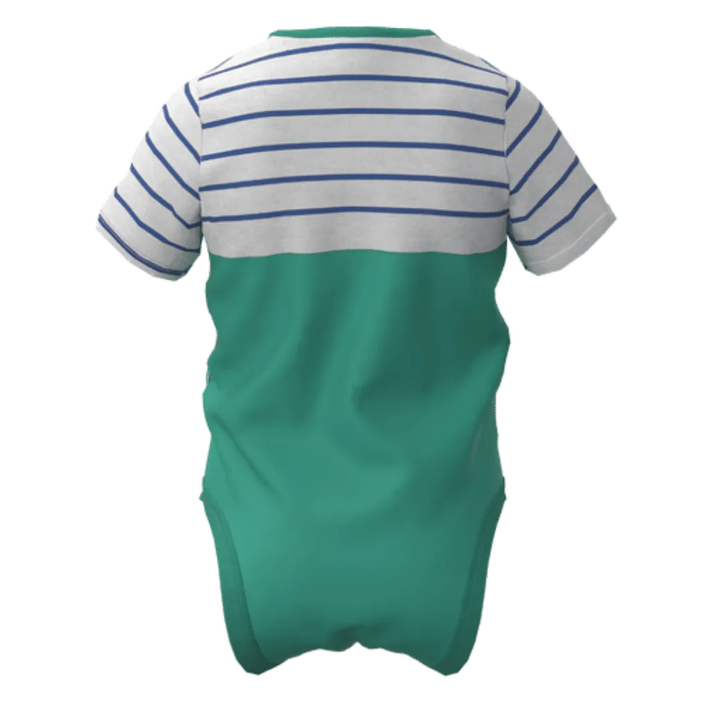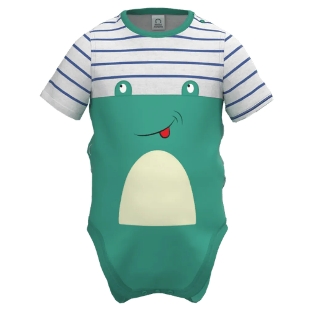 This Green Cotton Short Sleeve Romper features a cute frog face graphic with stylish striped shoulder detail, creating a fun and lovable look for your baby. Crafted from soft, breathable cotton fabric, this romper keeps your little one comfortable throughout the day while being gentle on delicate skin. The snap-button closure ensures quick and easy diaper changes, making it ideal for everyday wear.