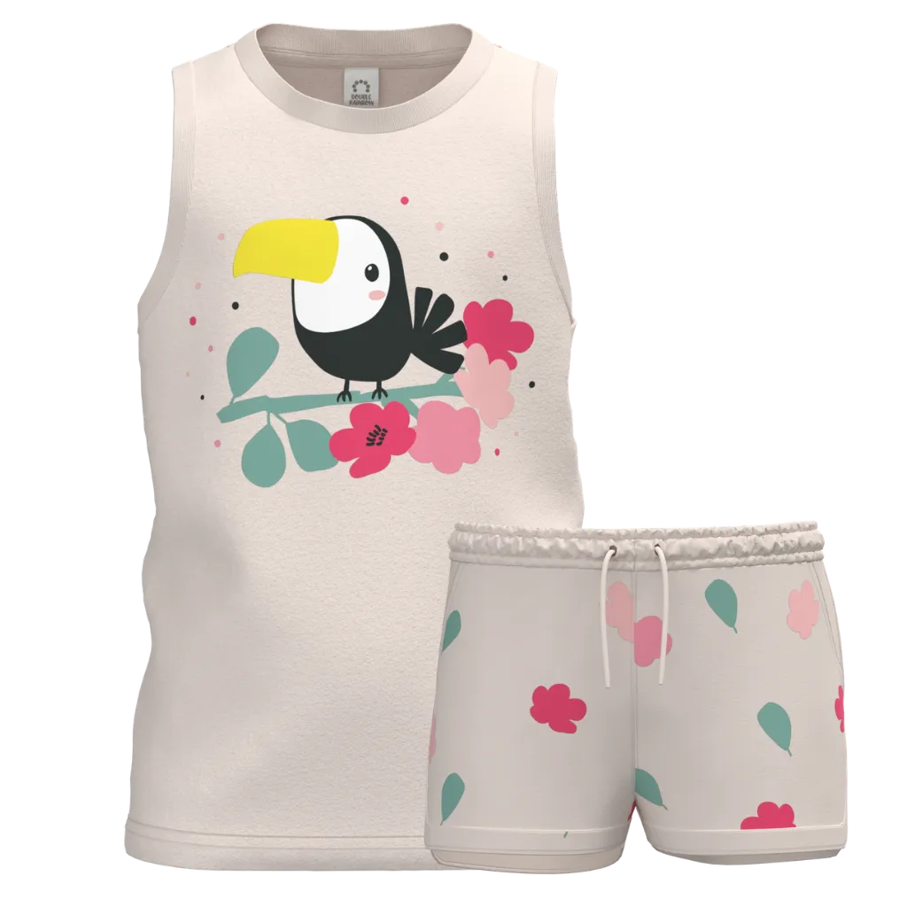Cream Cotton Sleeveless T-Shirt with Short Pant for Girls | Cute Toucan Print Summer Set | 1373