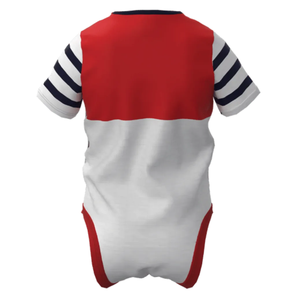This Red Cotton Short Sleeve Romper features a cute bear face graphic with stylish striped sleeves, creating a fun and lovable look for your baby. Made from soft, breathable cotton fabric, this romper keeps your little one comfortable throughout the day while being gentle on delicate skin. The convenient snap-button closure makes diaper changes quick and easy, making it perfect for everyday wear.