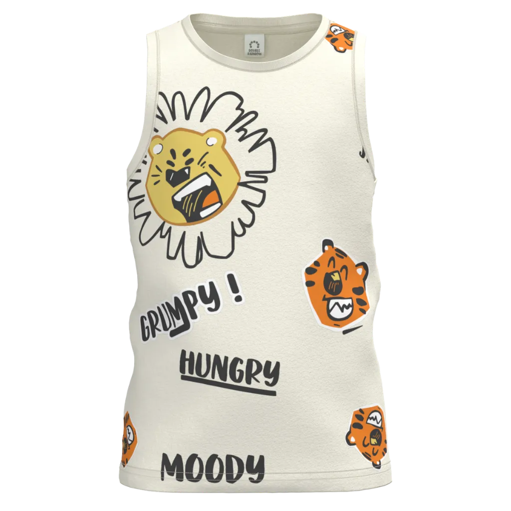 This Cream Sleeveless T-Shirt features a bold lion graphic with expressive cartoon faces and playful words like “Grumpy”, “Hungry”, and “Moody”, giving it a fun and energetic character kids will love. Made from soft, breathable cotton fabric, it keeps boys cool and comfortable throughout warm days. The sleeveless design allows easy movement, making it perfect for outdoor play, sports, and summer adventures.