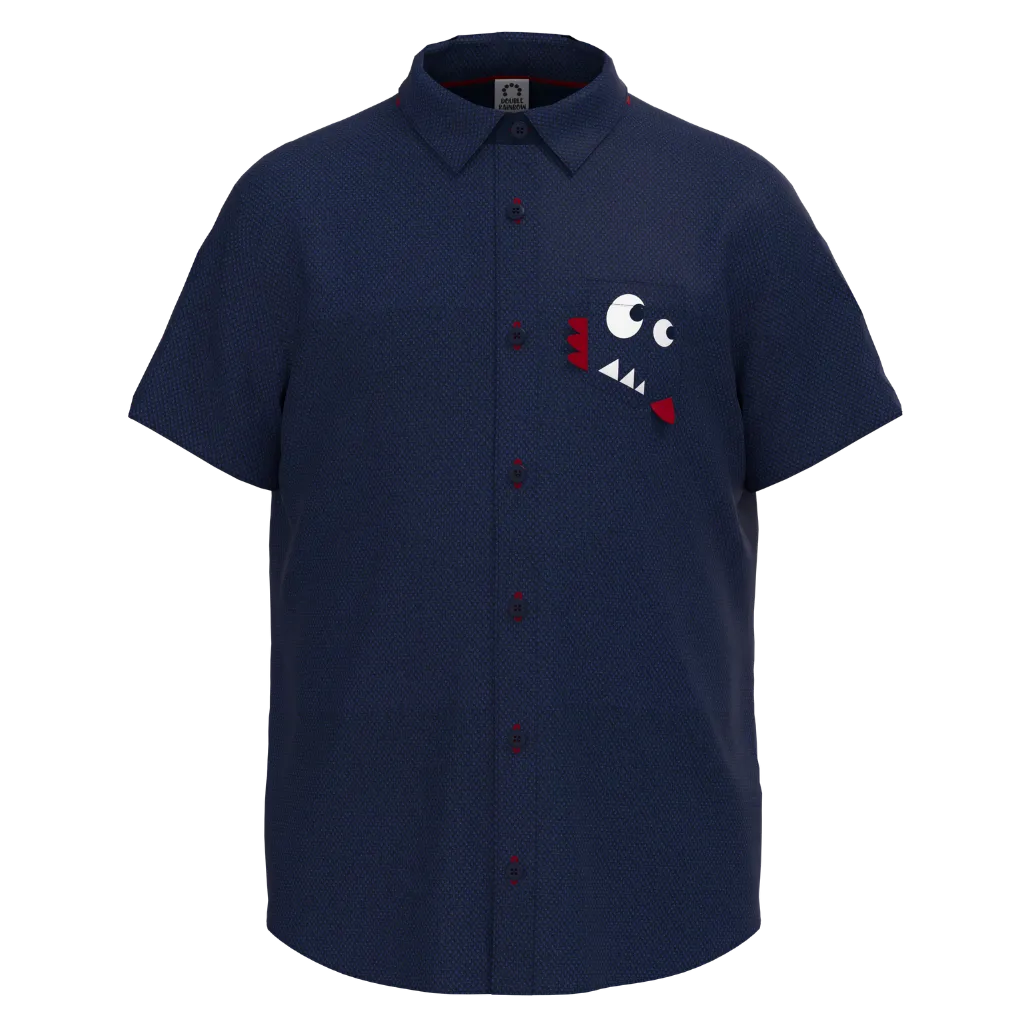 This Navy Short Sleeve Shirt features a fun monster face graphic peeking from the chest, adding a playful and quirky touch to a smart button-up design. The deep navy color paired with the cute monster detail creates a stylish yet fun look that kids will love.