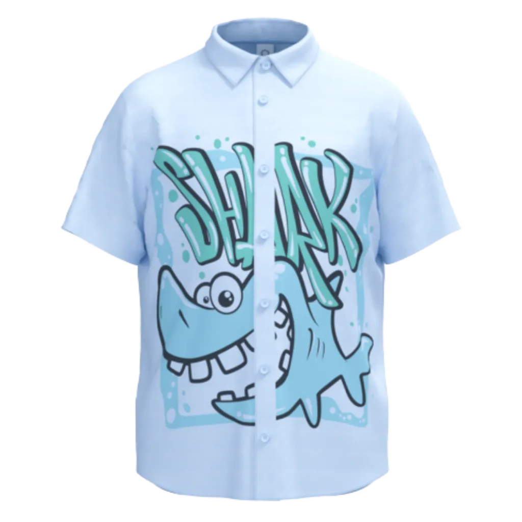 This Blue Cotton Short Sleeve Button-Down Shirt with a bold shark graphic design is perfect for boys who love playful and adventurous styles. Made from soft, breathable cotton fabric, it keeps your child cool and comfortable during warm days while offering a trendy look for school, outings, and casual events.