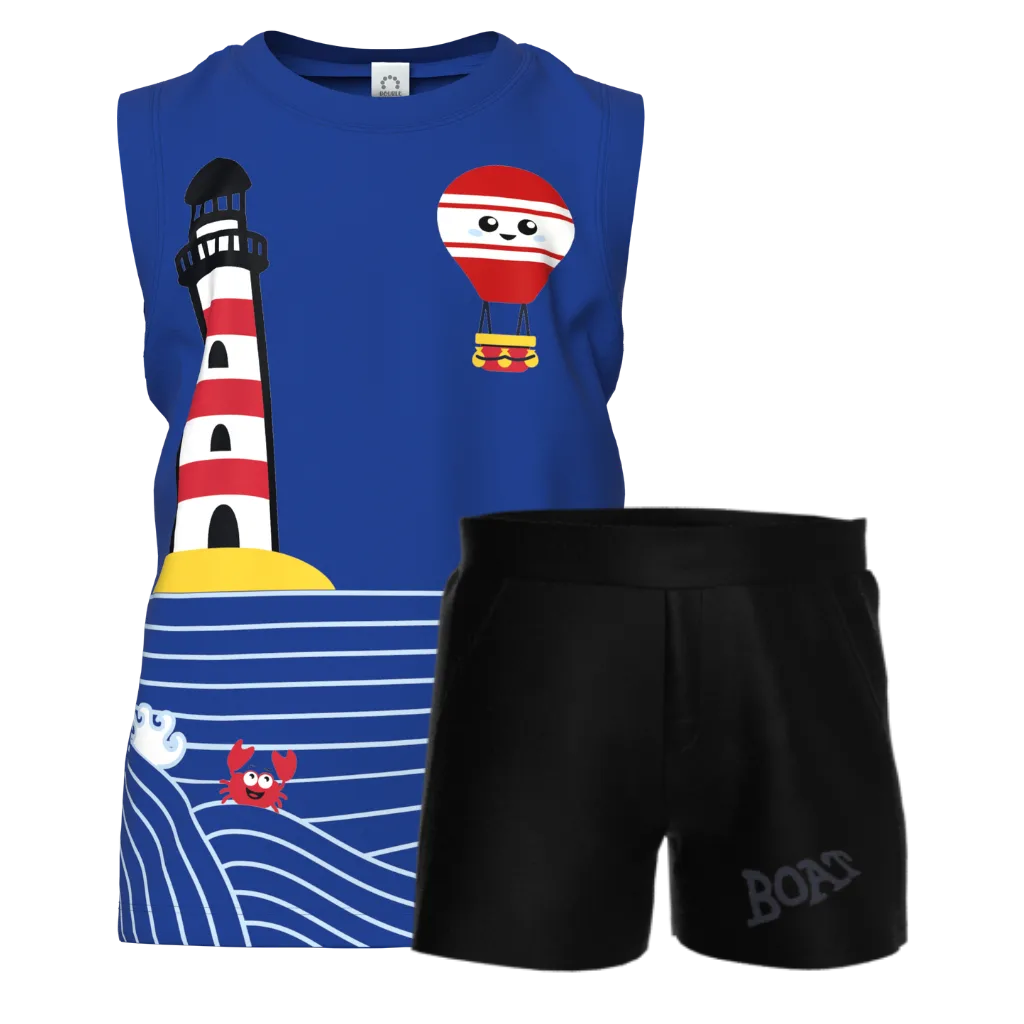 Blue Sleeveless T-Shirt & Black Short Pant Set for Boys | Lighthouse & Balloon Graphic Kids Summer Outfit | 1892