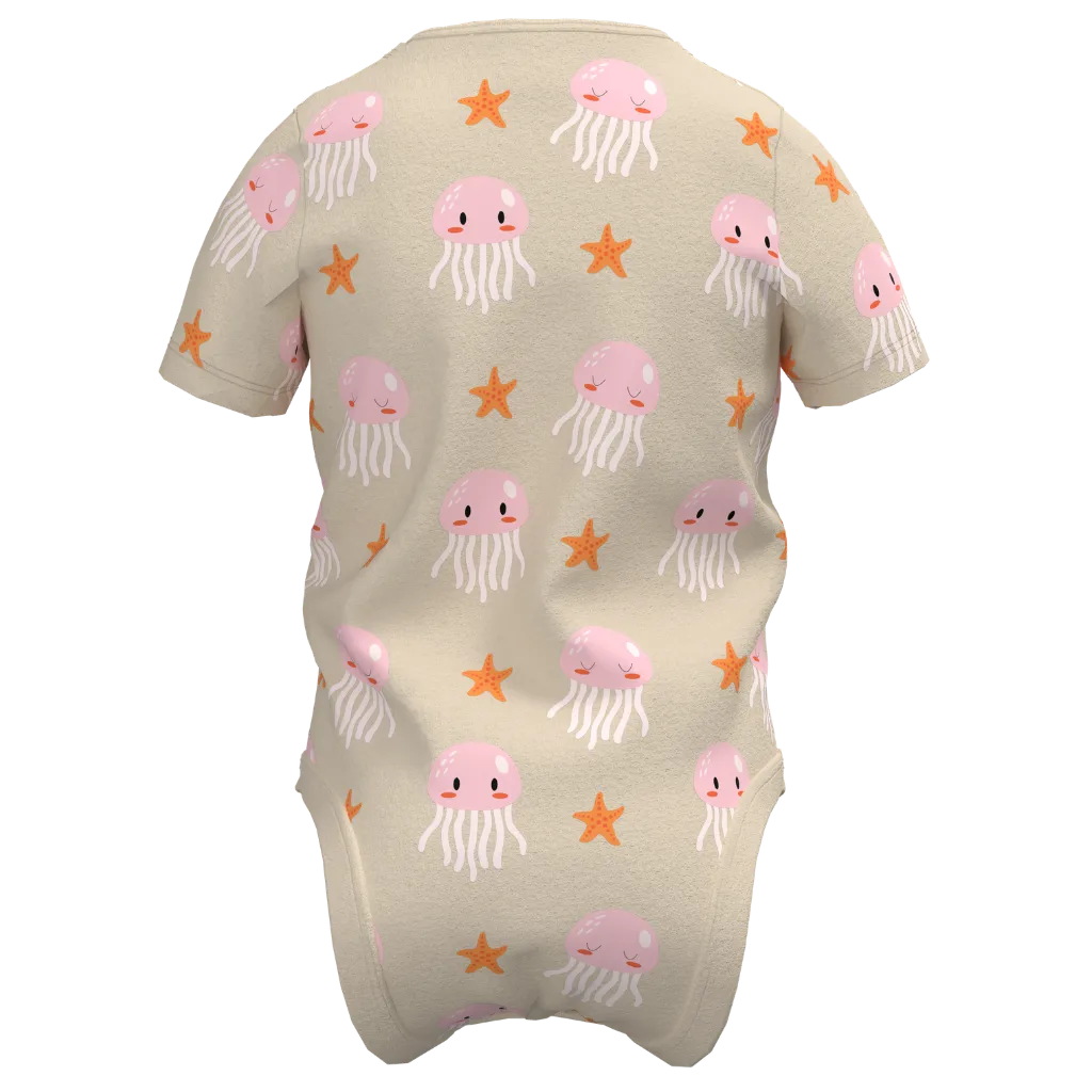 This Silver Grey Baby Romper features a charming jellyfish and starfish print inspired by the beauty of the ocean. The playful sea creature design adds a sweet and cheerful touch, making it perfect for your little one’s everyday outfit.